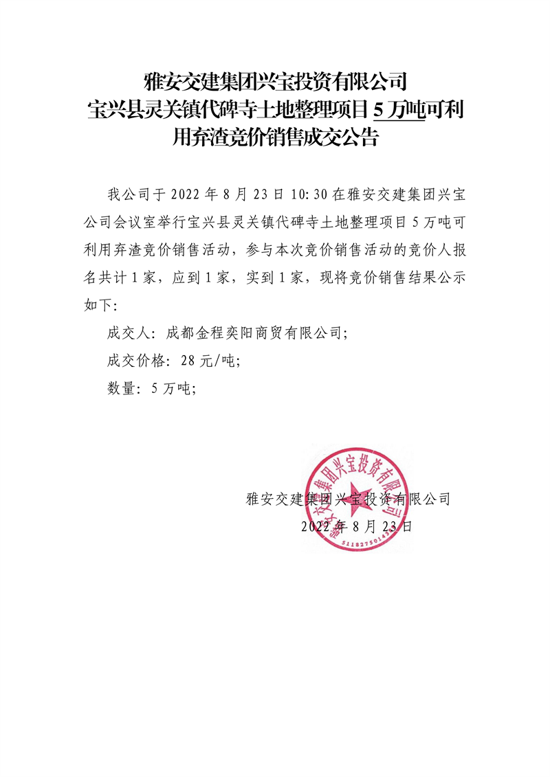 雅安交建集團(tuán)興寶投資有限公司寶興縣靈關(guān)鎮(zhèn)代碑寺土地整理項(xiàng)目10萬(wàn)噸可利用棄渣競(jìng)價(jià)銷(xiāo)售成交公告(8.23)