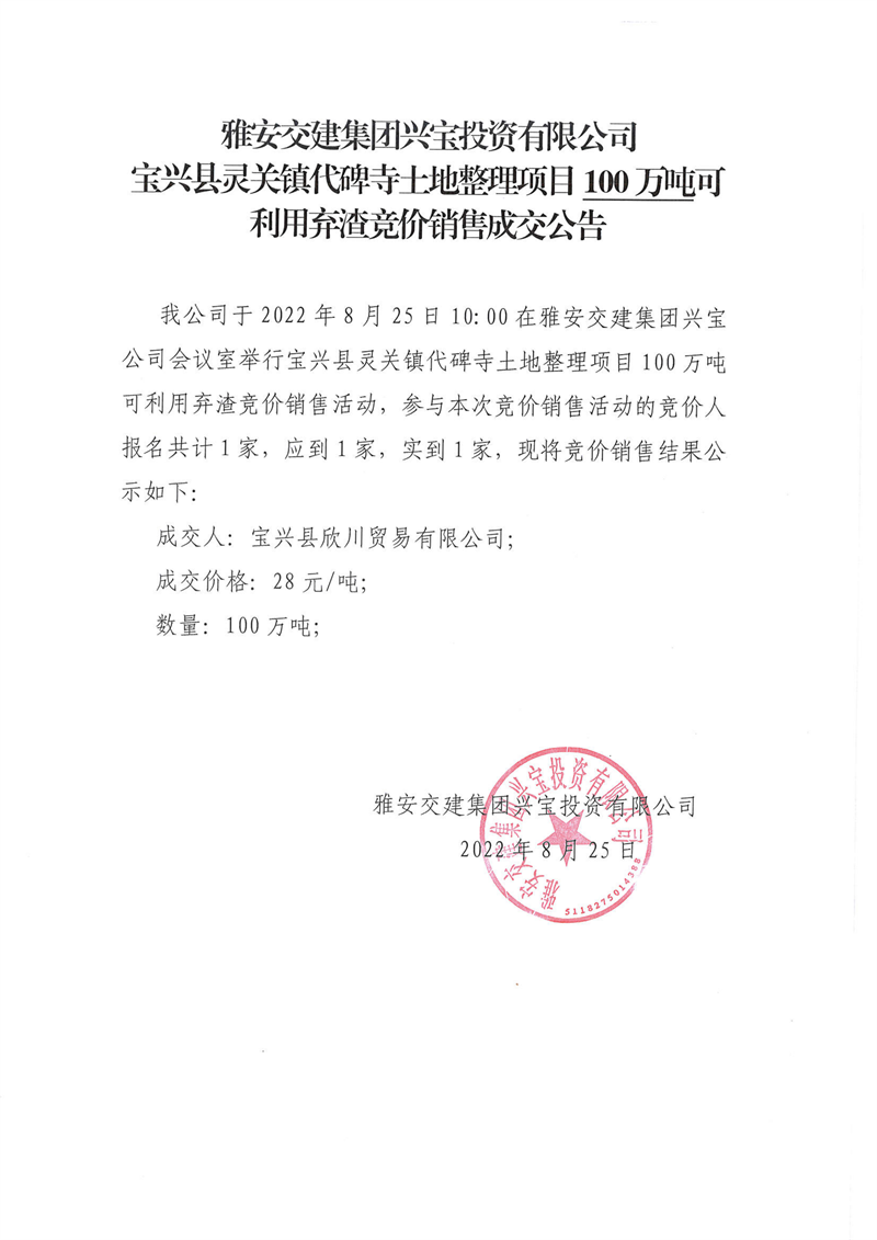 雅安交建集團(tuán)興寶投資有限公司寶興縣靈關(guān)鎮(zhèn)代碑寺土地整理項(xiàng)目5萬噸可利用棄渣競價(jià)銷售成交公告(8.23)