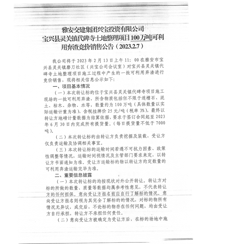 雅安交建集團興寶投資有限公司100萬噸可利用棄渣競價銷售流標公告(2023.2.13)