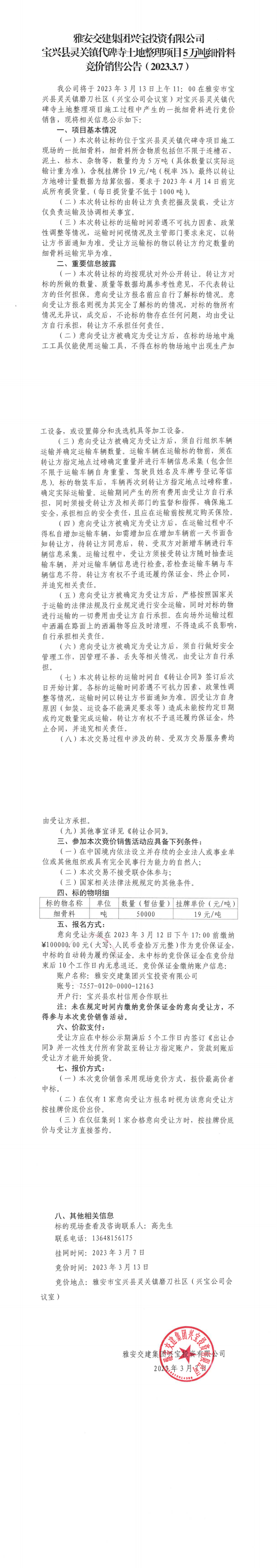 雅安交建集團(tuán)興寶投資有限公司寶興縣靈關(guān)鎮(zhèn)代碑寺土地整理項(xiàng)目5萬噸細(xì)骨料競價(jià)銷售公告(2023.3.7)