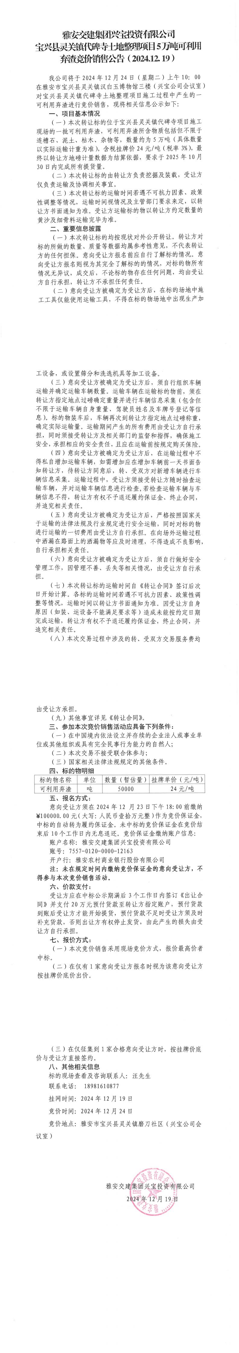 雅安交建集團(tuán)興寶投資有限公司靈關(guān)鎮(zhèn)代碑寺土地整理項(xiàng)目5萬(wàn)噸可利用棄渣競(jìng)價(jià)銷(xiāo)售公告(2024.12.19)