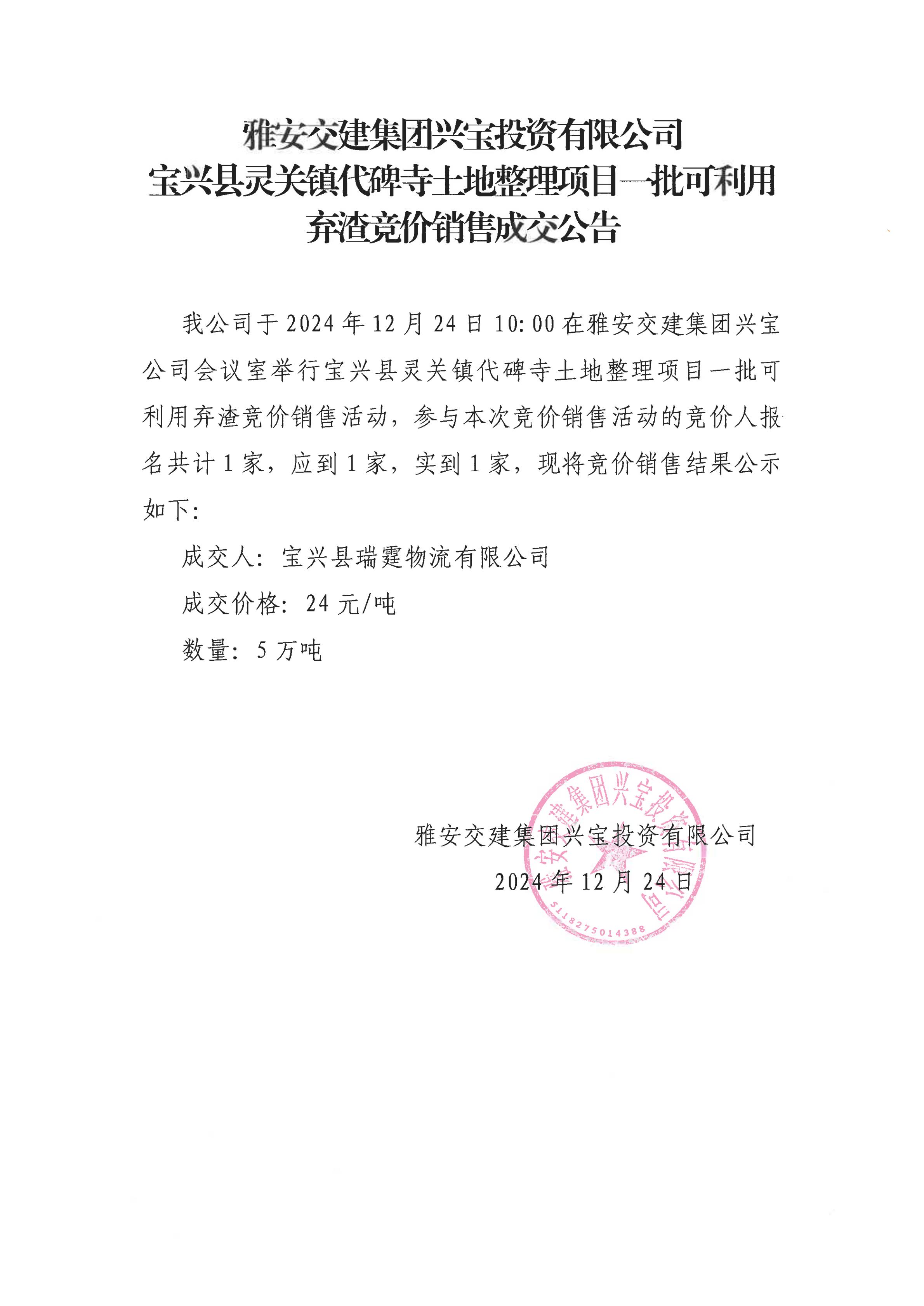 雅安交建集團(tuán)興寶投資有限公司靈關(guān)鎮(zhèn)代碑寺土地整理項(xiàng)目5萬(wàn)噸可利用棄渣成交公告(2024.12.24)